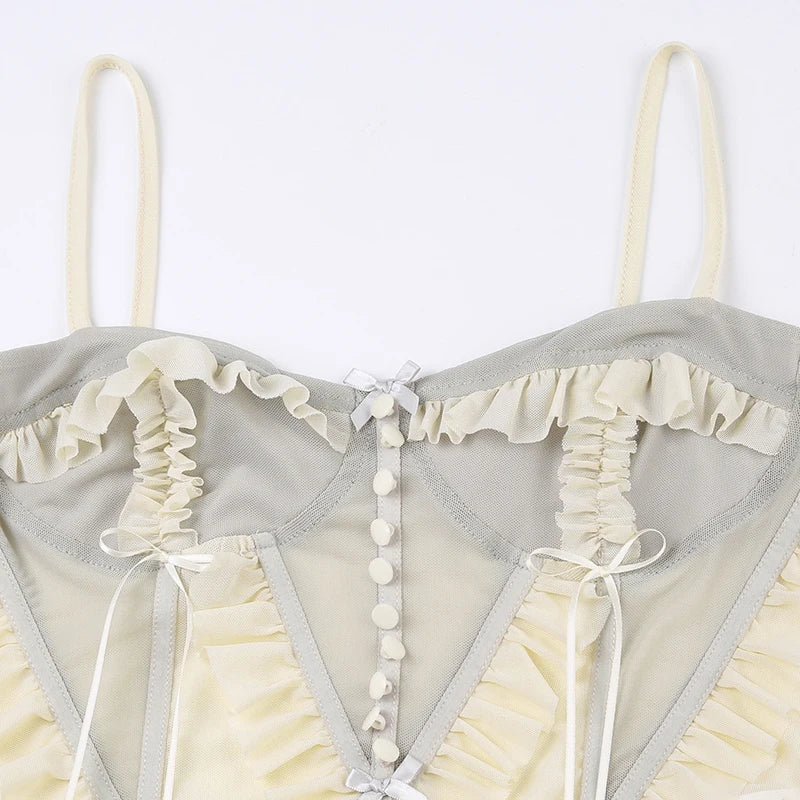 Slay in style with our Victoria Top! This mesh crop top features playful ruffles and cute button and bow details that add a touch of whimsy. With lined breast cups and stretchy fabric, this top provides both comfort and chicness. Get ready to make a statement in this must-have piece!