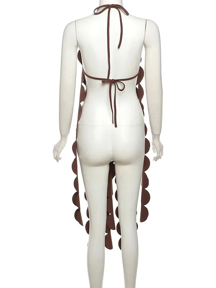 The Circle Cut-Out Tassel Halter is a stunning and unique top that is sure to turn heads. Featuring cascading circle cut-outs, this halter top adds a touch of whimsy and playfulness to your look. The halter neck style is flattering and perfect for showing off your shoulders. With adjustable ties and a tie-back closure, you can customize the fit to your liking. This top also offers stretch for added comfort and ease of movement. The size small shown on the mannequin gives you a preview of how fabulous you'll look in this stylish and trendy halter top.