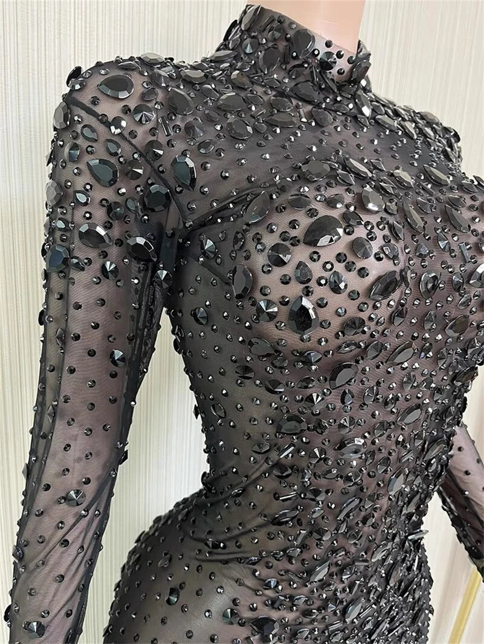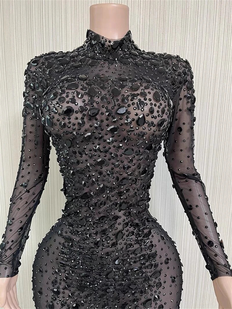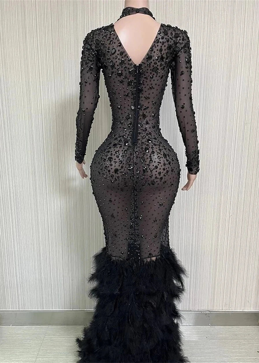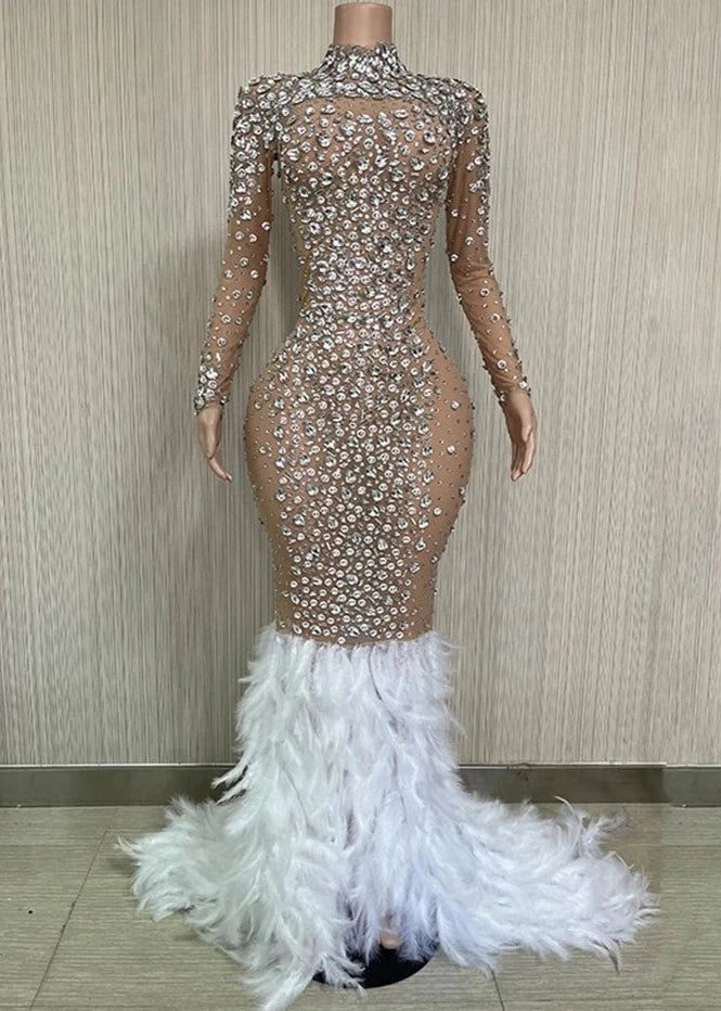 Make an unforgettable entrance in the Aurora Crystal Feather Gown, the epitome of luxury and elegance. This long-sleeve, turtleneck gown is crafted from sheer mesh and adorned with sparkling crystals throughout, creating a dazzling, show-stopping effect. The gown offers great stretch, ensuring a comfortable yet form-fitting silhouette that highlights your figure.