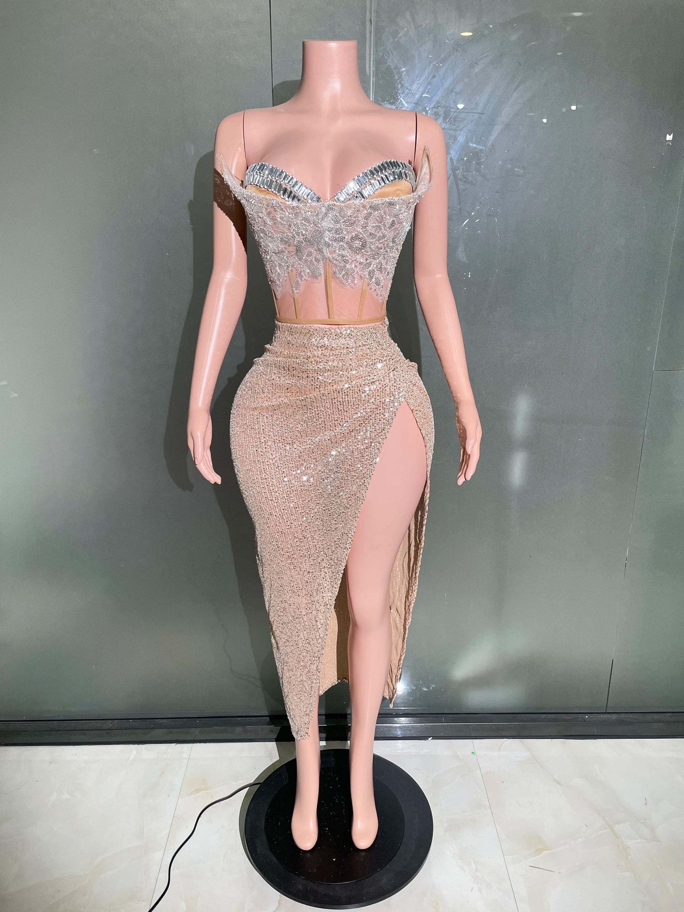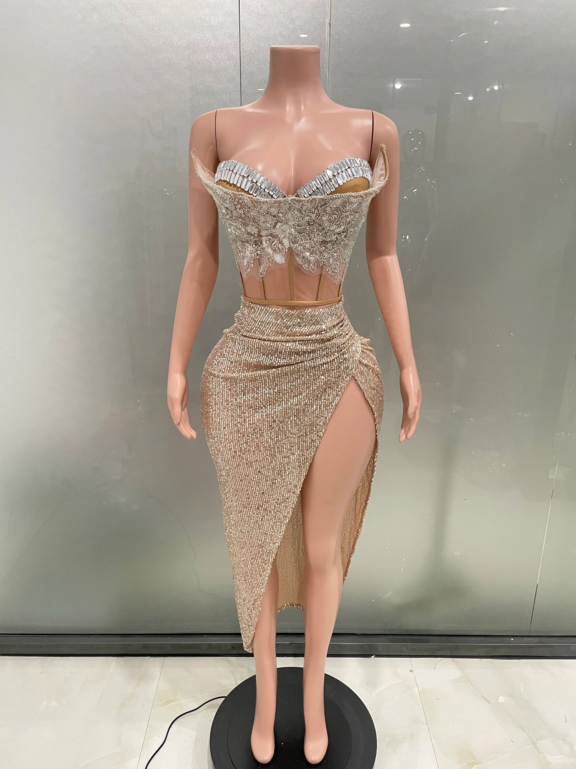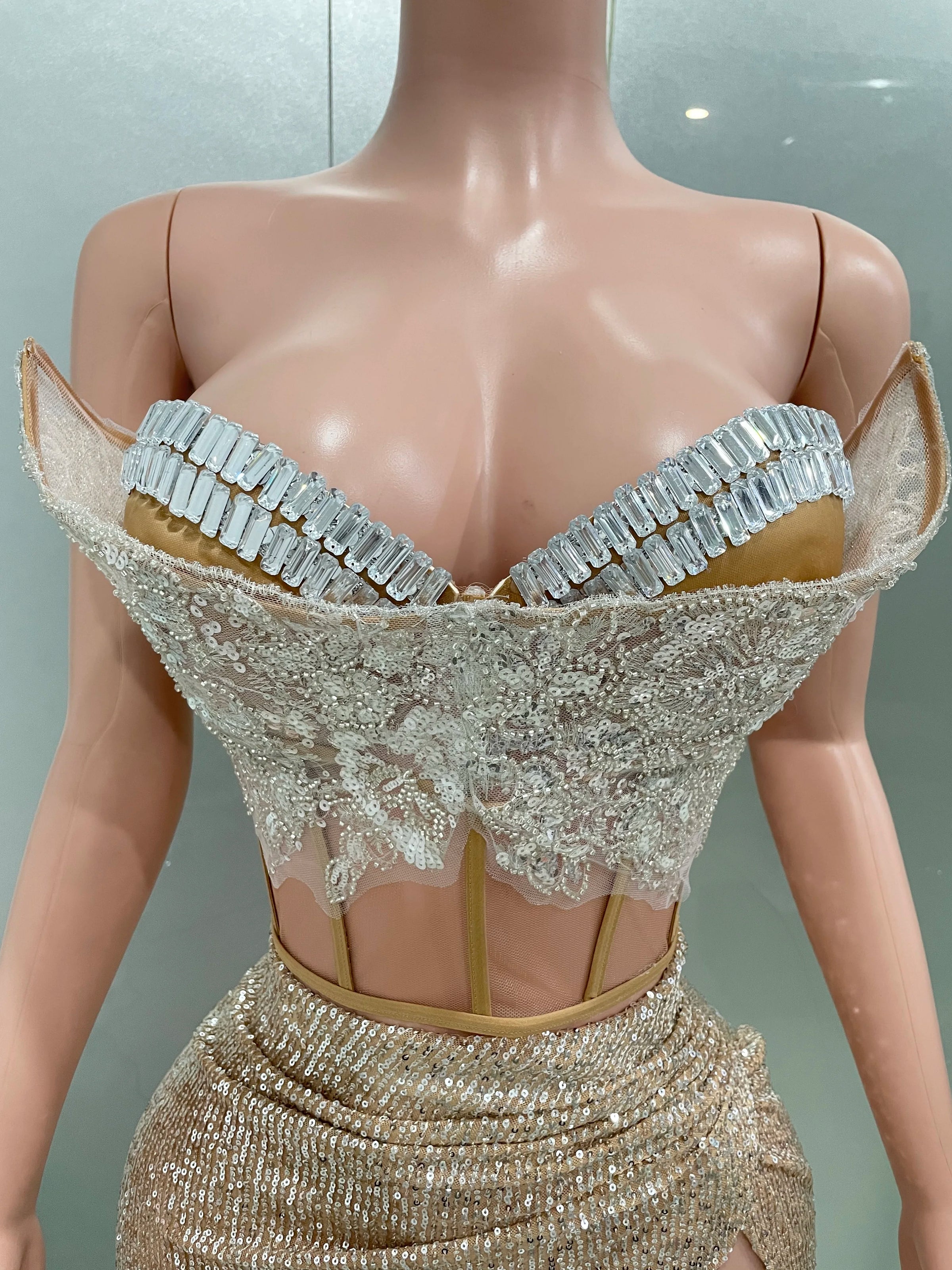 This dress is a true showstopper, perfect for formal events, galas, and special nights out. The shimmering sequins, paired with the intricate corset details, create an unforgettable look that will have all eyes on you.