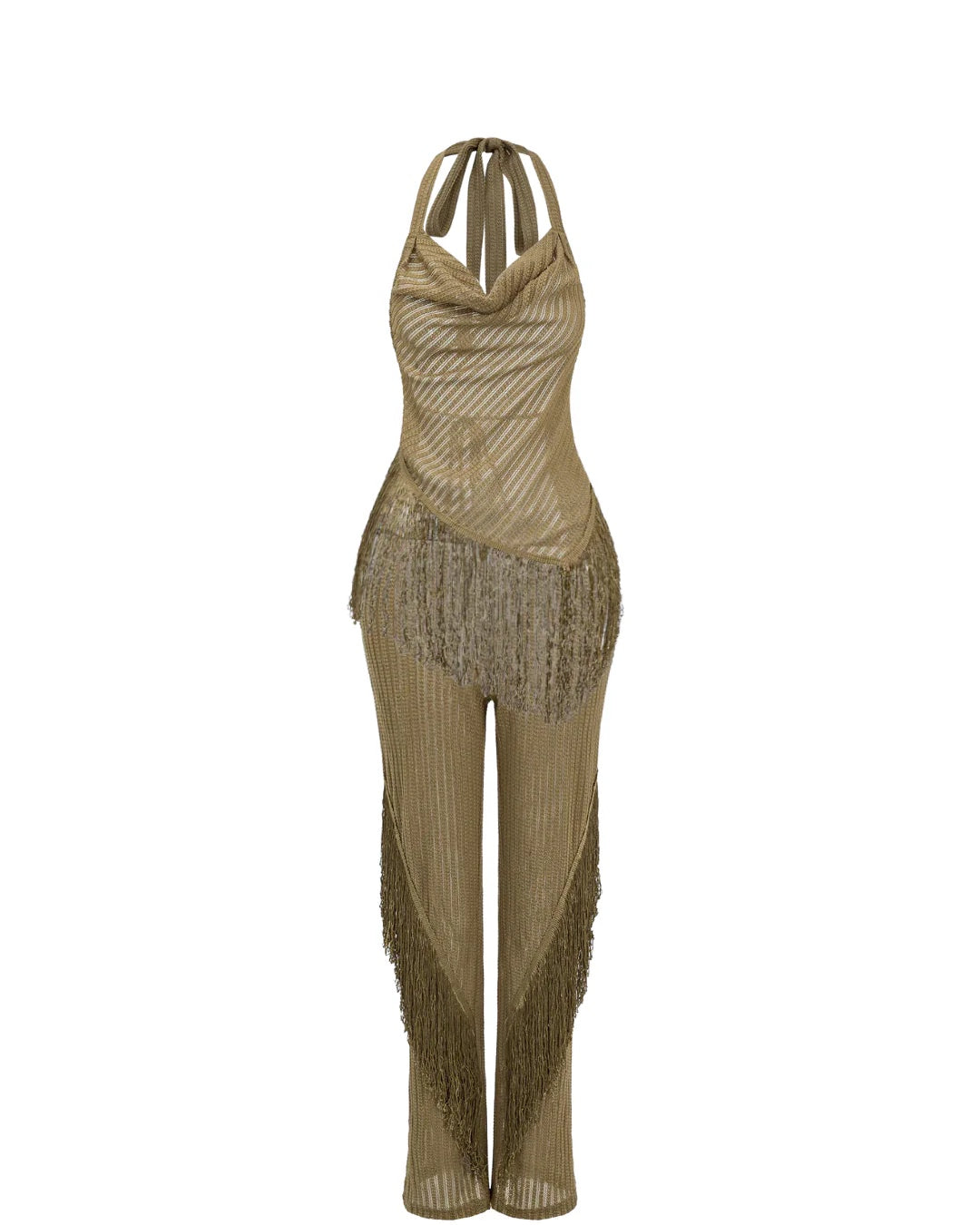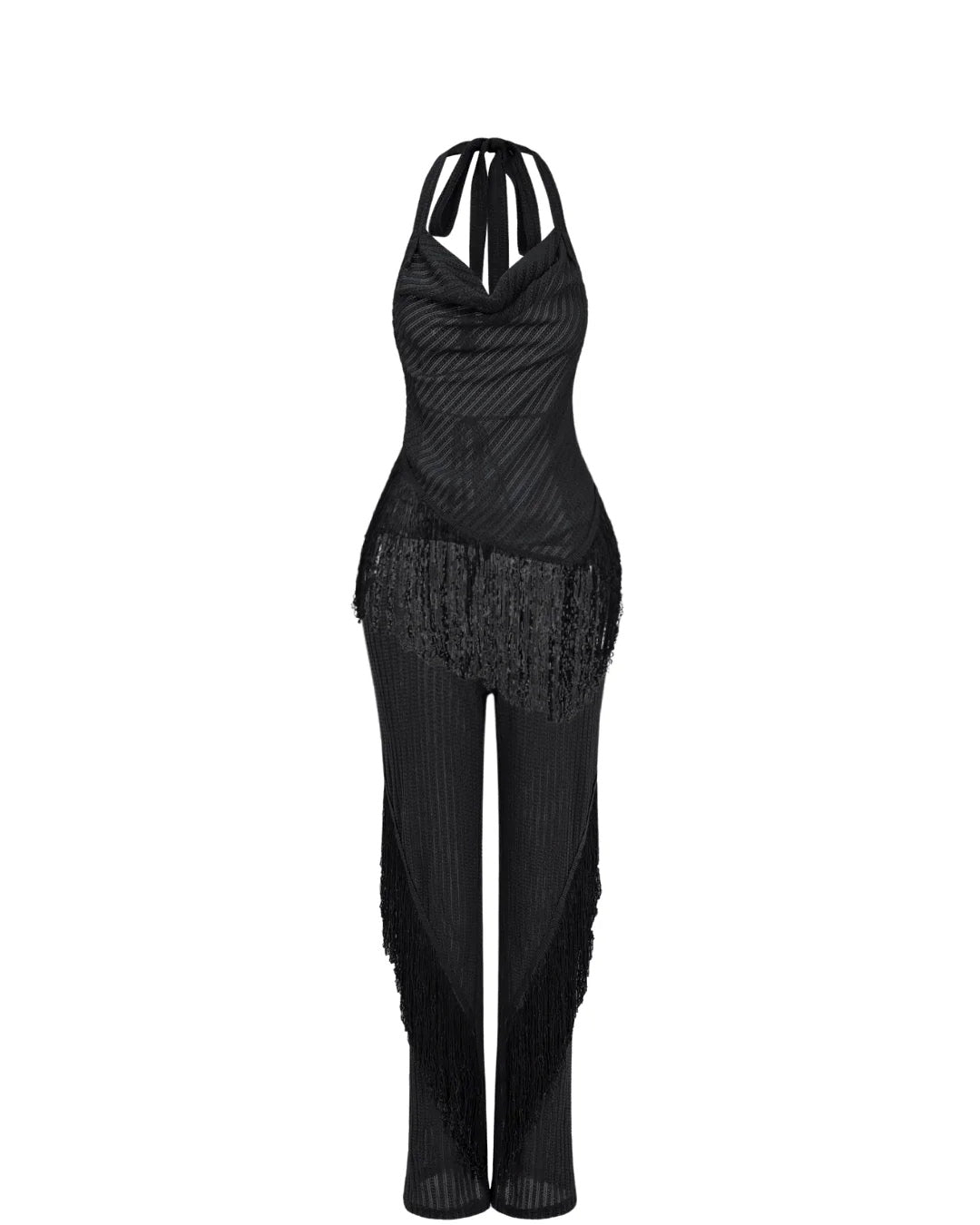 Be the life of the party in our Ari Fringe Pant Set! Perfect for special occasions, this set boasts a sheer, alluring design with 95% Polyester and 5% Elastane composition. The black color adds a touch of elegance while the fitted, low stretch fit highlights your figure.